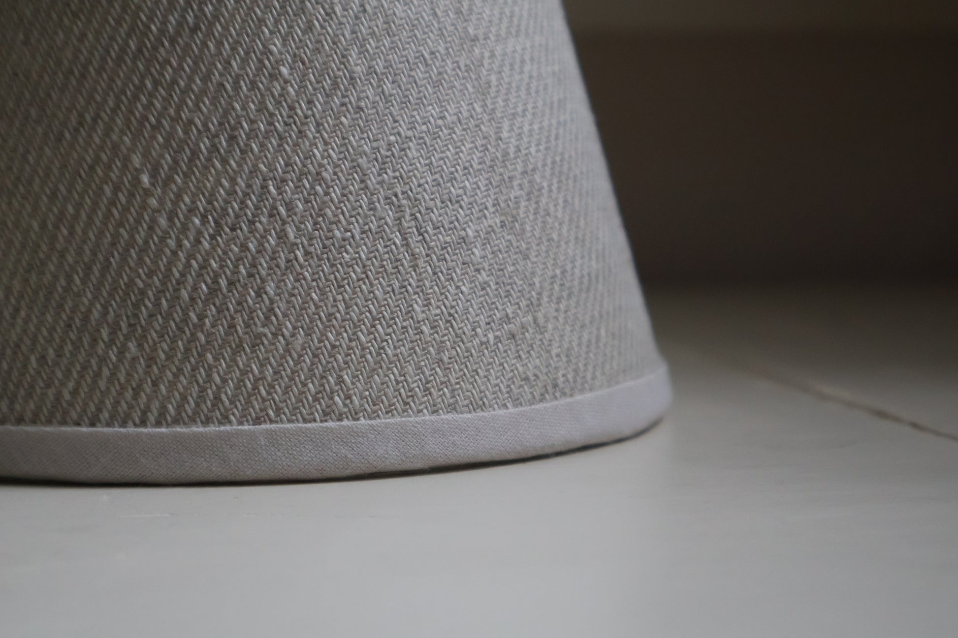 This handcrafted linen lampshade is made from natural linen and finished with a soft off-white trim — a simple, timeless design that works beautifully in both classic and contemporary interiors. Its neutral tones make it a versatile choice, adding gentle texture and warmth to wall lights, chandeliers, or small bedside lamps.
